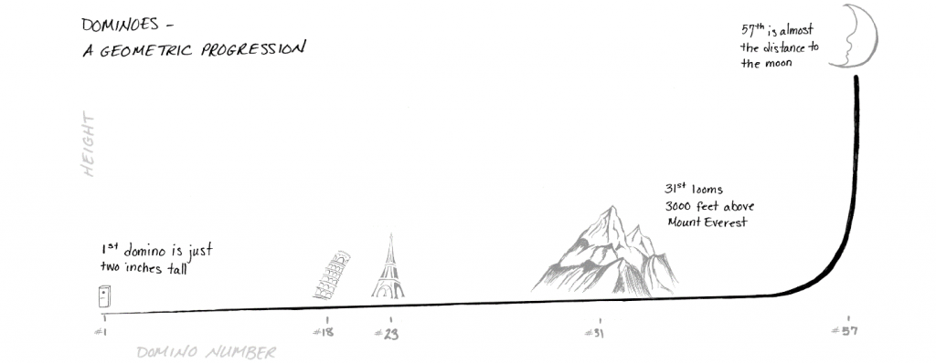 Denn Menschen unterschätzen die Wucht von kleinen Veränderungen und sind geblendet von den großen Träumen. Gary Keller beschreibt es treffend in seinem Buch ‘The One Thing’: Stell dir vor, du stellst 57 Dominos in einer Reihe auf. Der erste Domino hat eine Größe von 5 cm. Nun vergrößerst du die folgenden Dominos um das jeweils 1,5 fache (5 cm – 7,5 cm – 11,25 cm – . . .). Dann stößt du den ersten Domino um und löst eine Kettenreaktion aus. Mit dem 57-ten Domino entsteht eine Kraft, die einen Domino umschmeißen kann, der von der Erde bis zum Mond ragt.