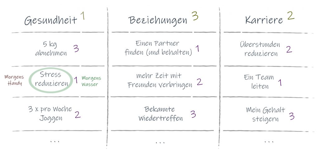 Damit die Liste hilft, statt zu hindern, gestalte sie so: drei Spalten – Gesundheit, Beziehungen, Karriere. Schreibe darunter alle Ziele, die dir im Kopf rumschwirren. Jetzt ordnest du die Ziele nach ihrer Wichtigkeit (1, 2, 3, 4, . . .). So entsteht pro Spalte ein Ziel, welches dir am wichtigsten ist. Und jetzt wählst du die Spalte aus, die dir am wichtigsten ist. So bleibt dein wichtigstes Ziel übrig. Ein Ziel – nicht 20, nicht 10, und nicht 3 – ein Ziel.